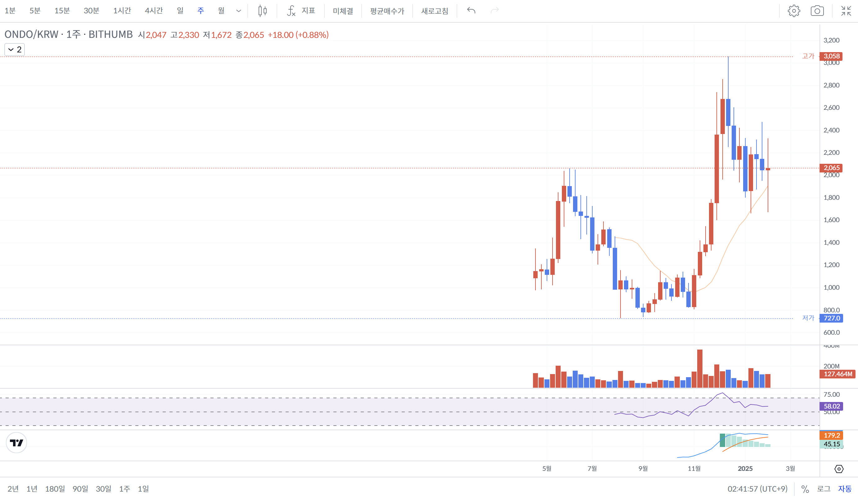주봉 차트에서는 장기 이동평균선 위에서 꾸준한 상승 흐름을 보이고 있습니다.